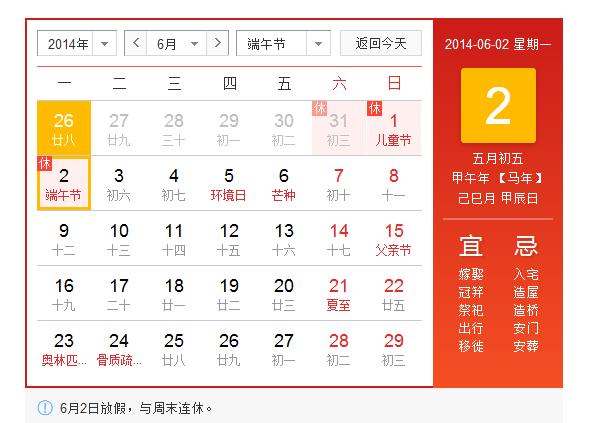 2014年端午節放假安排